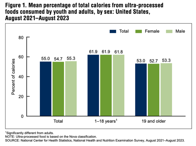 Among children, those between the ages of 6 and 11 years consumed the greatest percentage of calories (64.8%) from ultra-processed foods, compared to 12- to-18-year-olds at 63% and 1- to-5-year-olds at 56.1%.