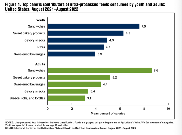 The researchers found that, for children, the top five sources of calories from ultra-processed foods were “sandwiches (including burgers), which contributed 7.6% of total calories, followed by sweet bakery products (6.3%), savory snacks (4.9%), pizza (4.7%), and sweetened beverages (3.9%) (Figure 4, Table 4).”