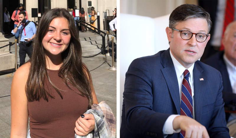 Laken Riley / Facebook (Left), Speaker Mike Johnson by Gage Skidmore / Flickr (Right)