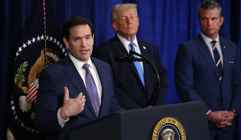 Secretary of State Marco Rubio speaks during a press conference as U.S. President Donald Trump and Secretary of War Pete Hegseth listen on Jan. 03, 2026, in Palm Beach, Florida. (Photo by Joe Raedle/Getty Images)