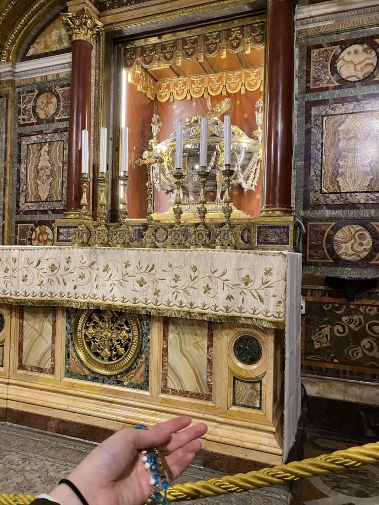 The reliquary, designed by Giuseppe Valadier in the 19th century, replaced a Renaissance urn stolen by Napoleon’s troops. A statue of the Christ Child on a pillow of hay, symbolizing His birth and the mystery of the Incarnation, rests on top of the reliquary.